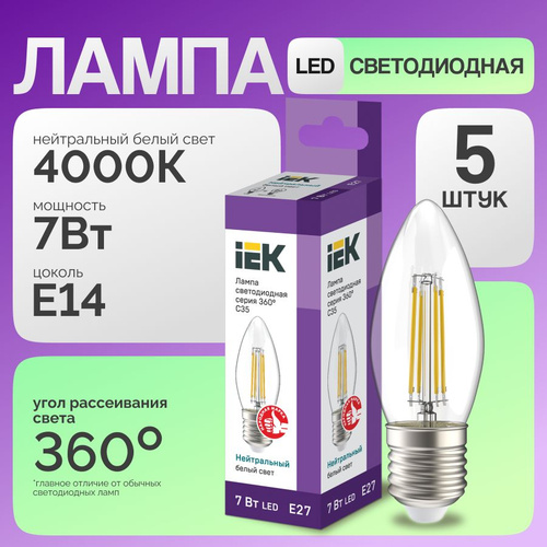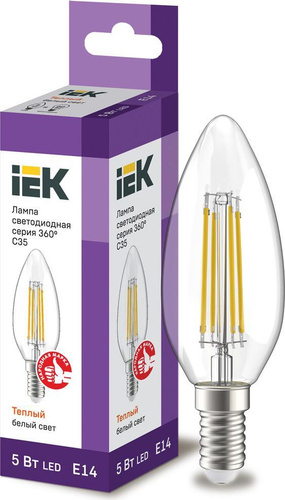 Светодиодная лампа IEK 360 град. 5W эквивалент 40W 3000K 600Лм E14 филаментная свеча