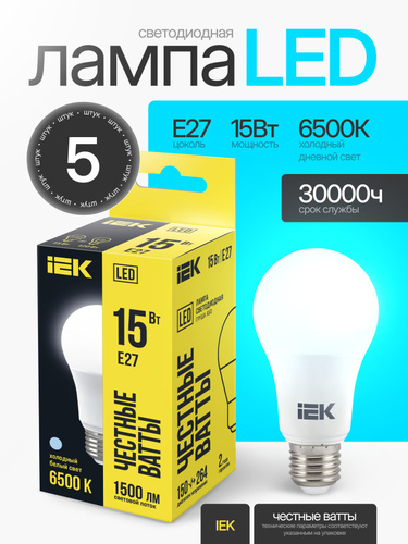 Лампочка Е27 15Вт 6500К холодный свет светодиодная энергосберегающая LED цоколь E27 A60 груша (комплект 5 шт)