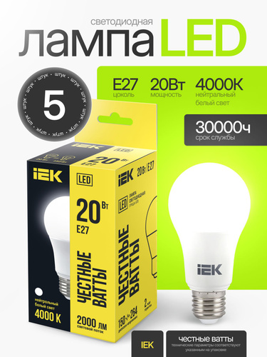 Лампочка Е27 20Вт 4000К нейтральный дневной свет светодиодная энергосберегающая LED цоколь E27 A60 груша (комплект 5 шт)