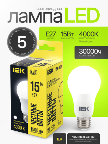 Лампочка Е27 15Вт 4000К нейтральный дневной свет светодиодная энергосберегающая LED цоколь E27 A60 груша (комплект 5 шт)