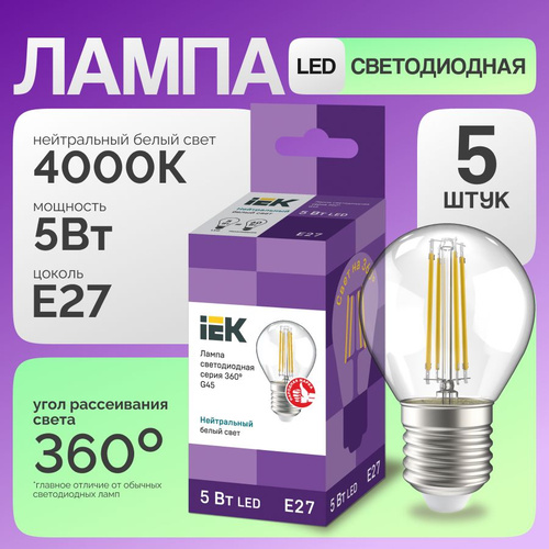Лампочка Е27 5Вт 4000К дневной нейтральный свет светодиодная энергосберегающая LED цоколь E27 G45 прозрачная филаментная (комплект 5 шт)