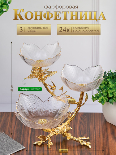 Фруктовница металлическая Блюдо этажерка 3-х ярусная 28х25х28 см,стекло, металл, покрытие 24K Gold Color Plated, кристаллы