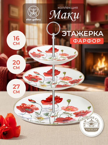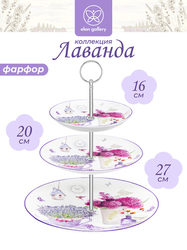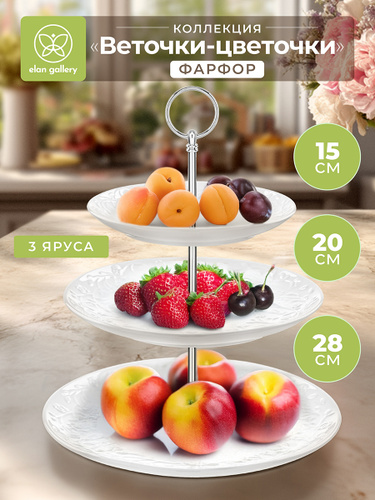 Блюдо сервировочное 3-х ярусное Elan Gallery Веточки-цветочки, фарфоровая этажерка для фруктов и десертов, диаметр 26/22/18 см