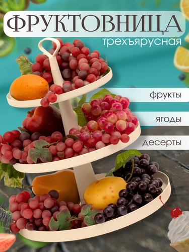 Фруктовница 3-х ярусная бежевая из пищевого пластика / этажерка корзина для фруктов, кондитерских изделий