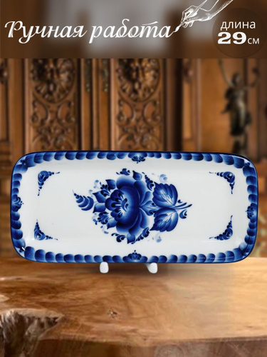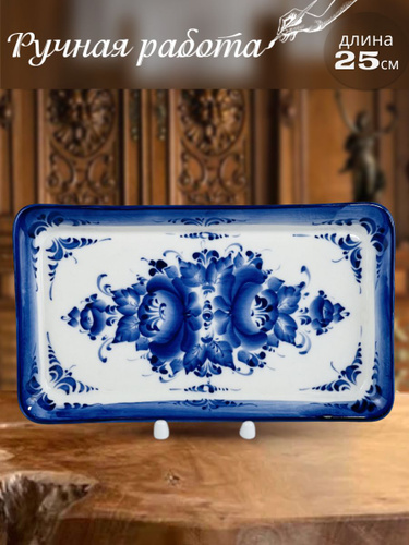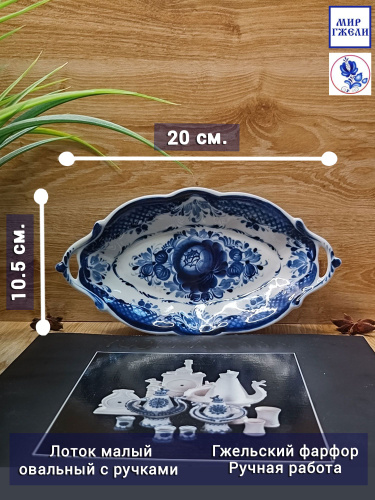 Лоток малый овальный с ручками Гжель, (гжельский тонкостенный фарфор, авторская роспись), длина 20 см.