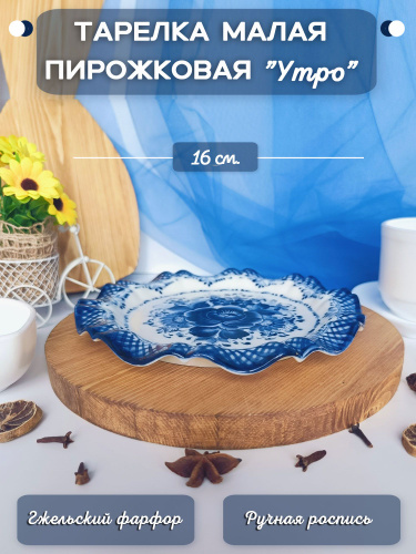 Тарелка пирожковая малая Гжель "Утро", (гжельский тонкостенный фарфор, авторская роспись), диаметр 16 см.