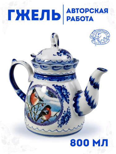 Чайник заварочный 800 мл "Подарочный.Снегири с ситечком". Галактика г.Гжель. Фарфор, ручная работа.
