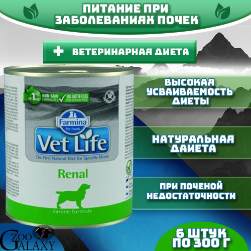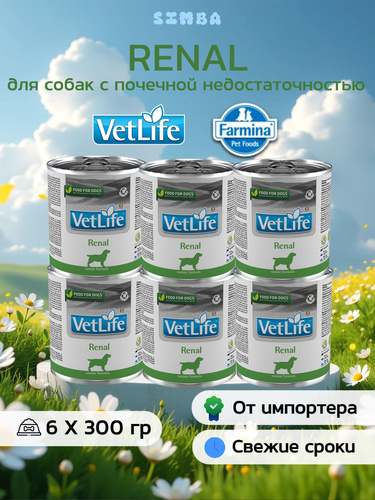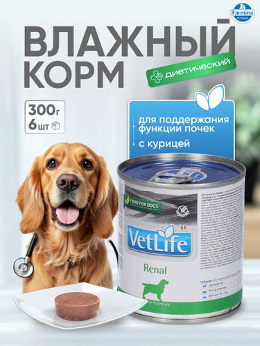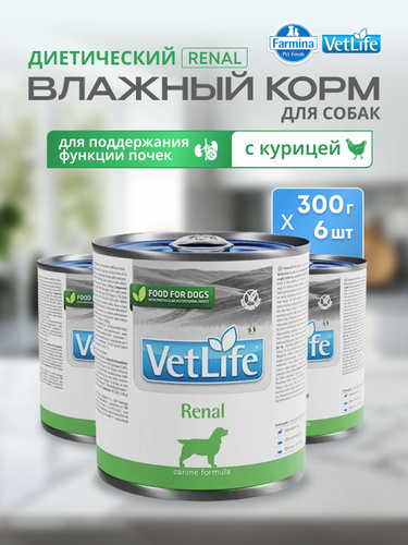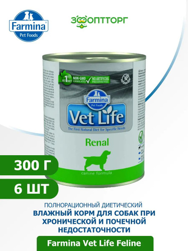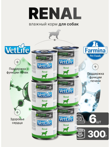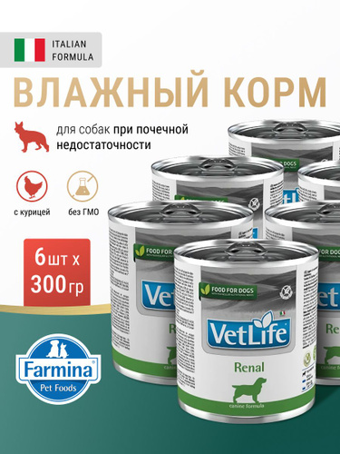 Диетический влажный корм для собак 6шт х 300гр При заболеваниях почек, почечной недостаточности, ХПН, МКБ Вет Лайф Ренал farmina Vet Life Renal