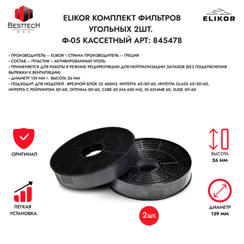 Комплект угольных фильтров Elikor Ф-05 (845478) для кухонной вытяжки, 2 шт, Греция
