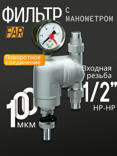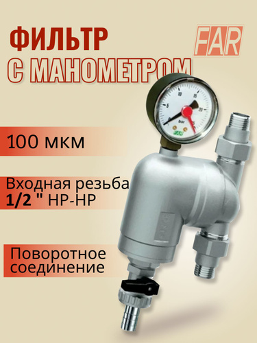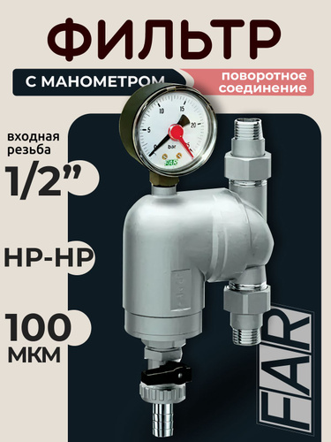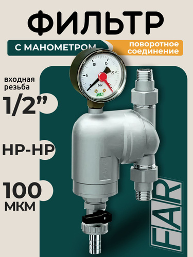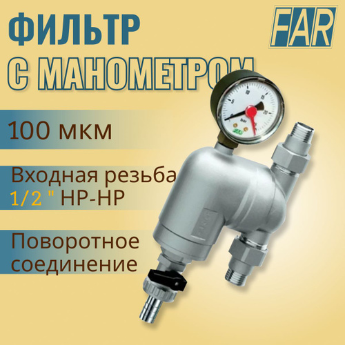 Фильтр с поворотным соединением FAR 39A4 12100 1/2" НР-НР, сетка 100 мкм с манометром