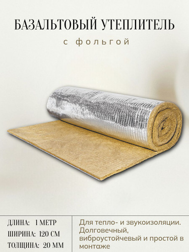 Утеплитель фольгированный / базальтовый мат (2000х1200х20 мм). Теплоизоляция и звукоизоляция для труб, бань и саун