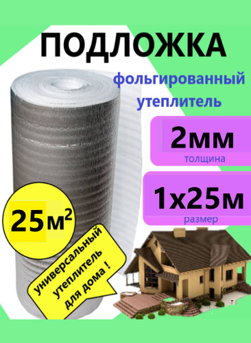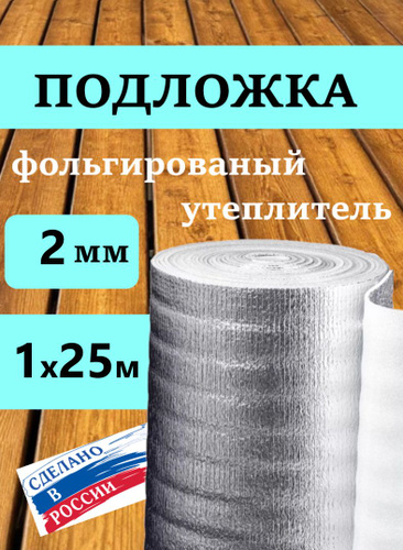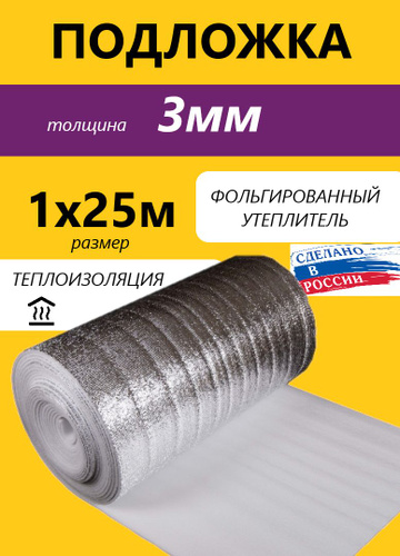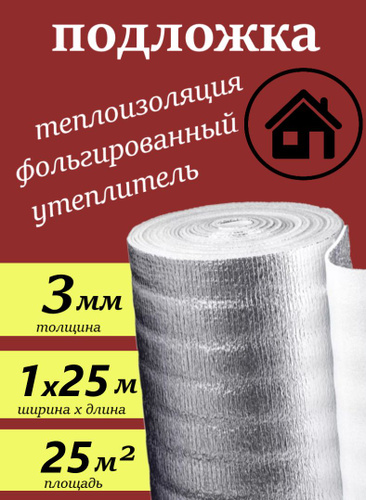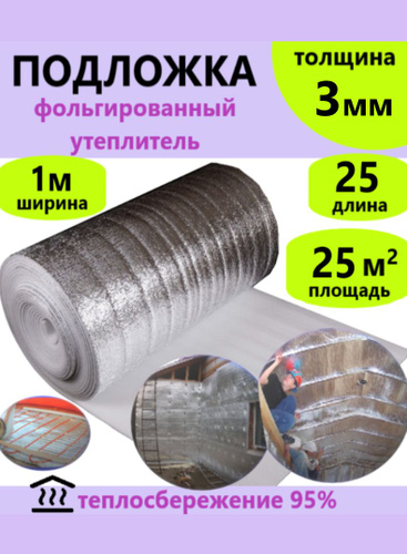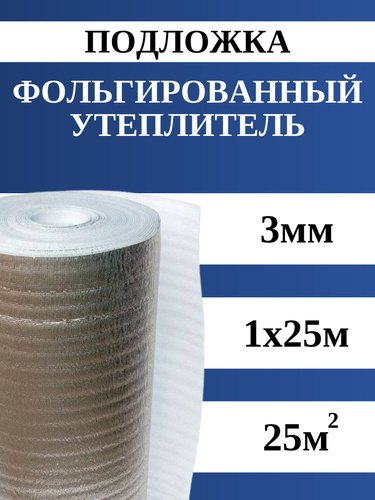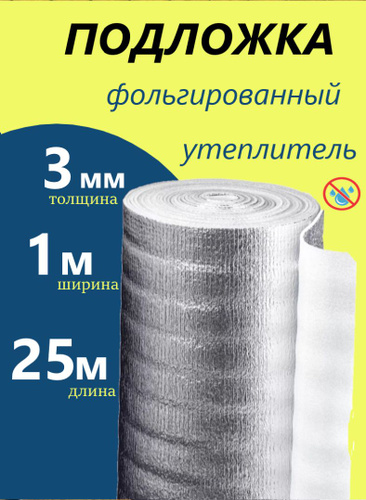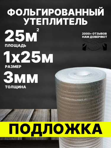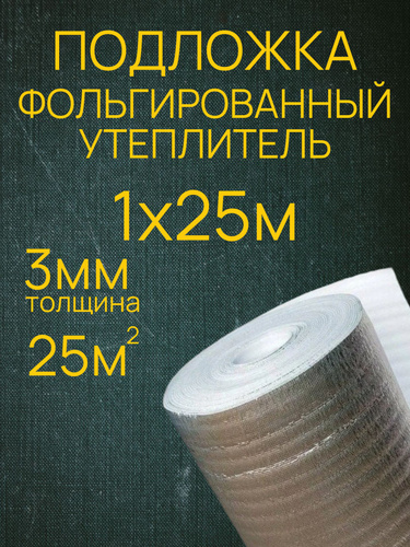 Подложка 3мм 1х25м 25м.квадратных теплоизоляция фольгированная, пароизоляция, гидроизоляция, шумоизоляция