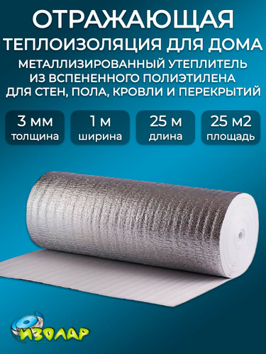 Фольгированный утеплитель 3мм для стен труб рулон 25м2 ИЗОЛАР/ Теплоизоляция отражающая для пола и потолка/ фольгоизолон