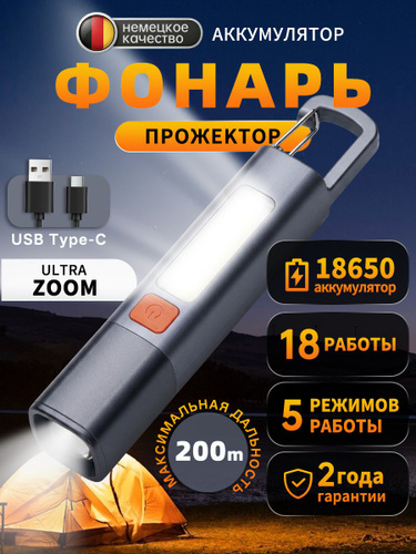 Фонарь-прожектор перезаряжаемый аккумуляторный LED с 3 режимами, фокусируемый, водонепроницаемый, для кемпинга, туризма, дома и экстренных ситуаций, с крючком и USB-C зарядкой