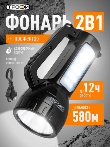 Фонарь прожектор аккумуляторный Трофи PA-504 мощный ручной светодиодный походный с боковым светильником, 2 режима