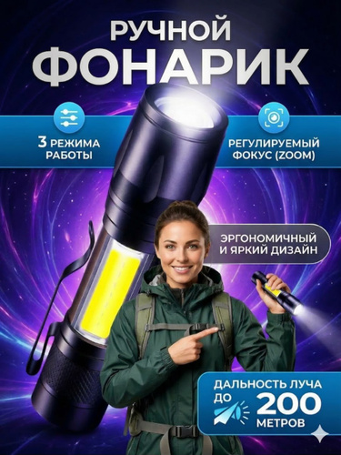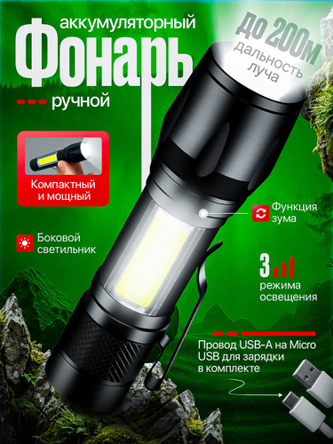 Фонарик аккумуляторный ручной, 3 режима освещения, дальность 200 м