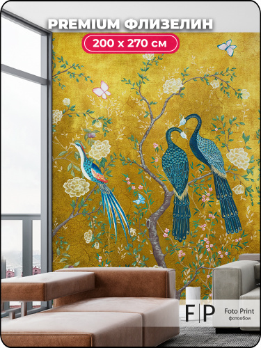 Фотообои на стену флизелиновые "Птицы на ветвях цветущих деревьев на золотом фоне" 200x270 см (ШxВ), фотообои природа, птицы, фреска