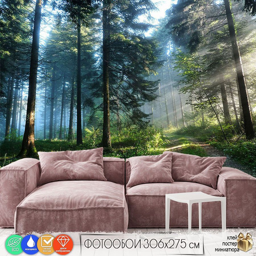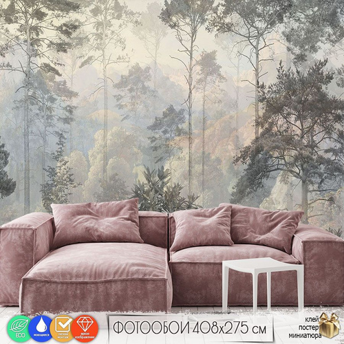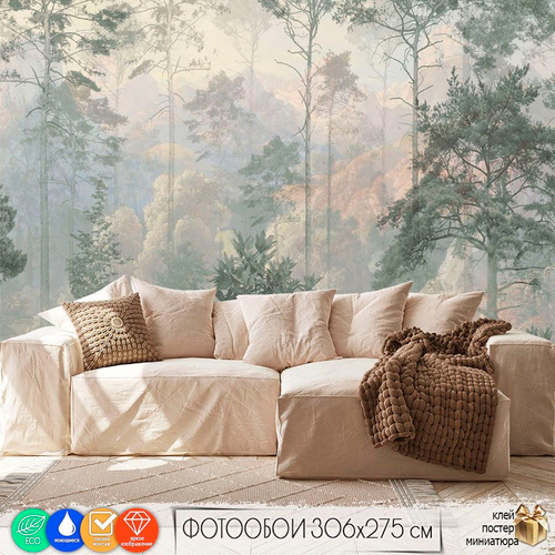 Флизелиновые фотообои 3Д на стену DreamWall "Туманный лес Арт. 70367" 306х275 см, моющиеся виниловые обои на кухню, в детскую, с эффектом 3d для спальни, декор для интерьерного покрытия в доме