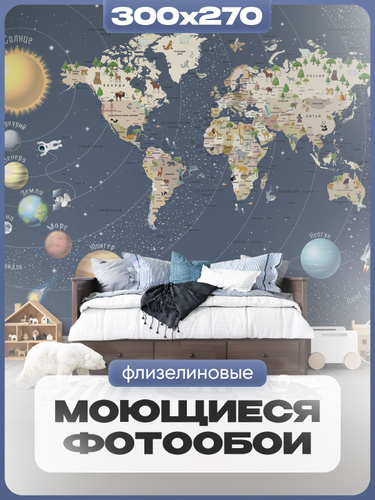 Auroom Фотообои детские для мальчика "Карта мира" 300х270, флизелиновые, моющиеся, в детскую. Товар уцененный