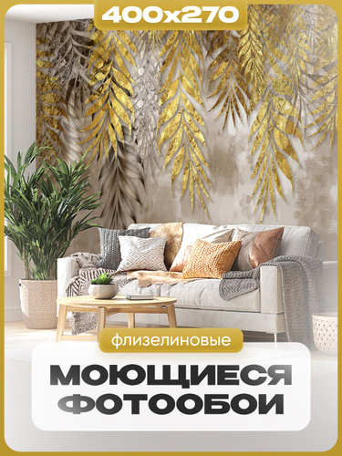 Фотообои на стену флизелиновые 400х270 см Пальмовые листья теплые бежевые на кухню, в спальню, рельефные, моющиеся. Товар уцененный