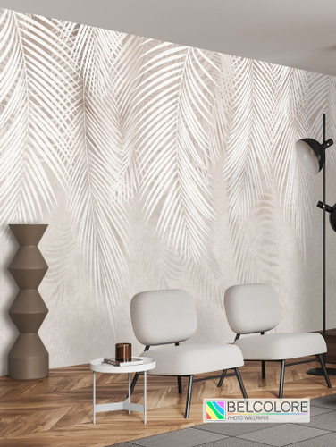 Фотообои на стену флизелиновые Серо-бежевые пальмовые листья на стене, 500х270 см, гладкие, без ПВХ. Товар уцененный