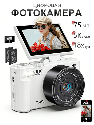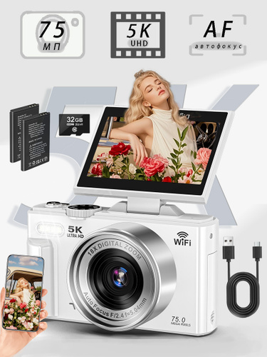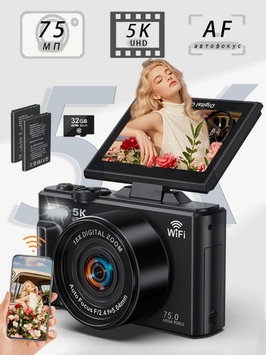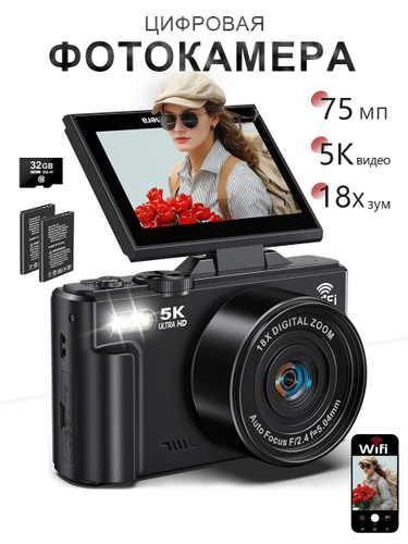 Цифровая камера 5K UHD 75 МП с Wi-Fi, 18-кратным зумом, откидным экраном, с SD-картой объемом 32 ГБ и 2 батареями.