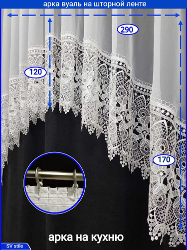 Тюль арка на кухню 290 х170 вуаль с вышивкой 30 см ,в спальню, короткая, белая на ленте.