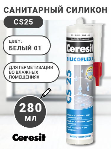 Санитарный силикон Ceresit белый (01) 280 мл, сантехнический, герметик, заделка, шовный