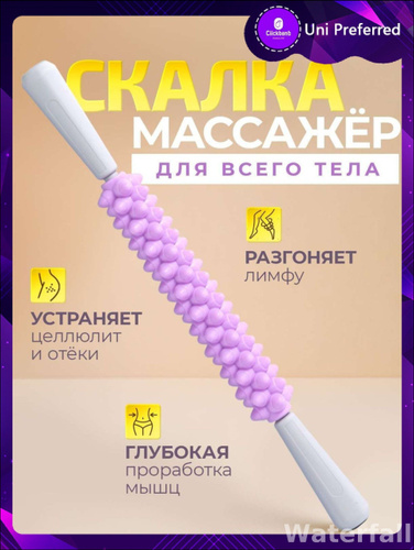 Эксклюзивный антицеллюлитный массажер для тела ручного типа, роликовая скалка обеспечивает массаж зон спины, ног и живота, представлен в сером и фиолетовом цвете, габариты 46.5 на 4.5 см