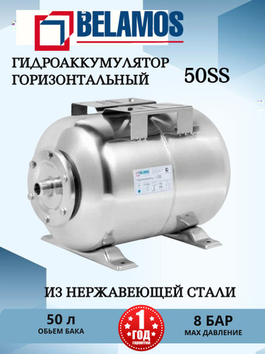 Гидроаккумулятор Belamos (Беламос) 50 SS, 50 литров, горизонтальный из нержавеющей стали, для водоснабжения, 1"