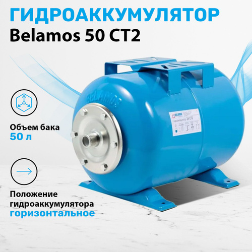 Гидроаккумулятор 50 литров горизонтальный Belamos 50 CT2. Расширительный мембранный бак для холодной воды / соединение 1" / цвет синий