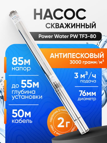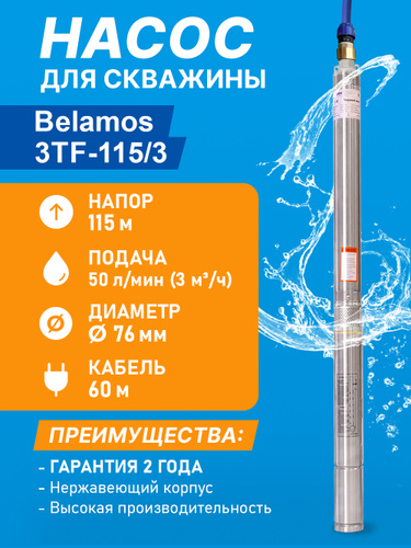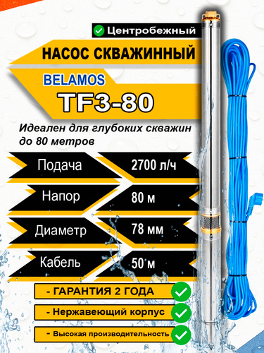Насос погружной скважинный Belamos TF3-80 (45 л/мин, Н-85 м, d-78 мм, каб. 50 м). Насос для скважин центробежный БЕЛАМОС