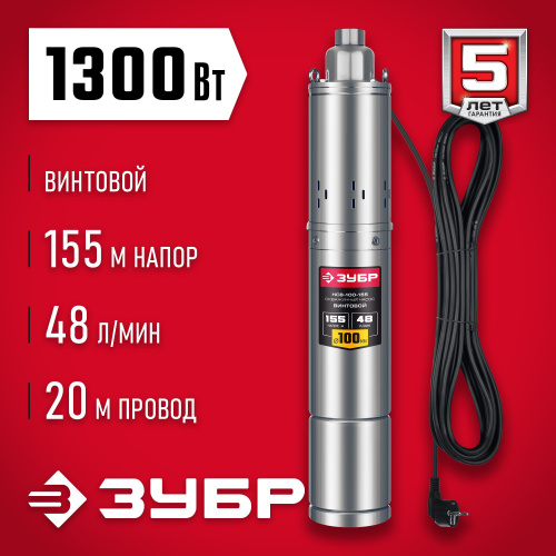 ЗУБР 1300 Вт, 155 м напор, скважинный винтовой насос, корпус из нержавеющей стали (НСВ-100-155)