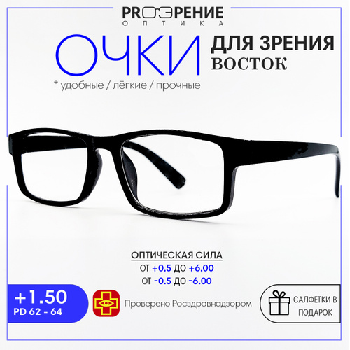 Готовые очки для зрения с диоптриями +1.50 ВОСТОК/Marsello, корригирующие очки мужские/женские, черные (2салфетки)