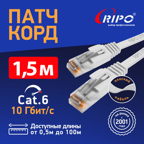 Плоский патч-корд 1,5 метра Cat6, белый, кабель для интернета RJ45, витая пара UTP, до 10 Гбит/с, для роутера/ПК/ТВ/ноутбука, многожильный LAN-кабель, 4 пары, RIPO