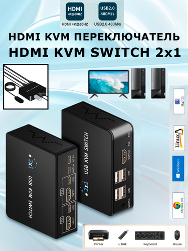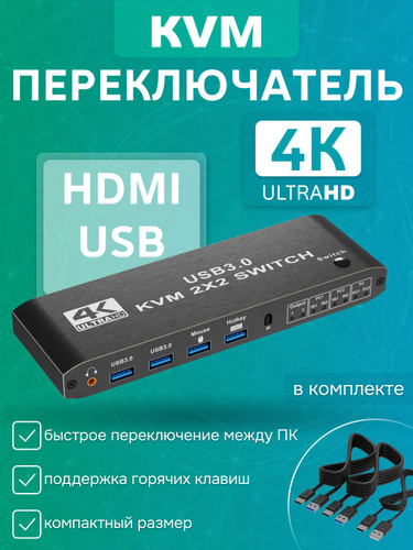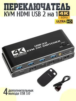 Свитчер, KVM переключатель HDMI USB 4K 60Hz 2-1 с 4 доп. выходами USB 3.0 и выносной кнопкой + пульт, модель 2024 года