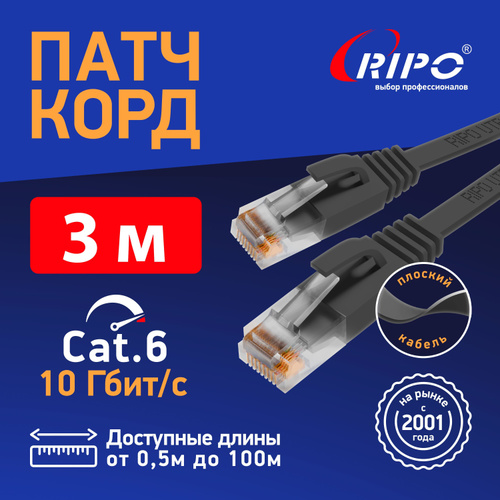 Плоский патч-корд 3 метра Cat6, черный, кабель для интернета RJ45, витая пара UTP, до 10 Гбит/с, для роутера/ПК/ТВ/ноутбука, многожильный LAN-кабель, 4 пары, RIPO