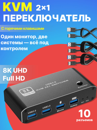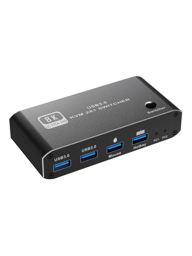 KVM переключатель 2x1 USB 3.0 HDMI 2.1 с горячими клавишами GSMIN поддержкой видео 8K 60Hz (Черный)