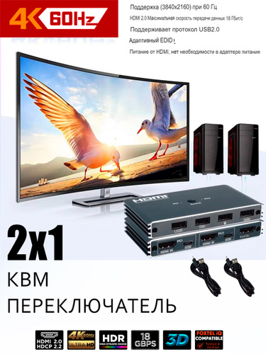 КВМ Переключатель 2х1 HDMI-USB, поддержка 4К-60HZ, HDMI 2.0, HDCP 2.2