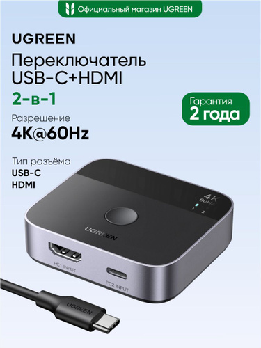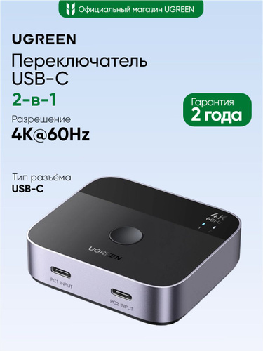 Переключатель UGREEN AW502 (55451) USB-C Switch 2 In 1 Out 4K@60Hz. Цвет: черный