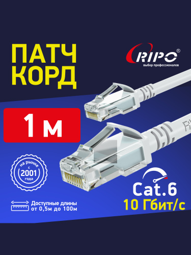 Патч-корд литой, интернет кабель RIPO, UTP4 Cat 6, RJ45, ССА, 1м белый