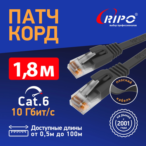 Плоский патч-корд 1,8 метра Cat6, кабель для интернета RJ45, витая пара UTP, до 10 Гбит/с, для роутера/ПК/ТВ/ноутбука, черный, многожильный LAN-кабель, 4 пары, RIPO