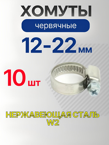 Хомут червячный 12-22 мм, набор 10 шт., нержавеющая сталь W2 (металлический, для шлангов)
