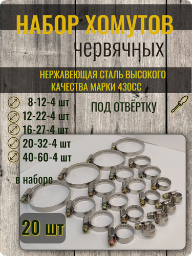 Набор хомутов червячных из 5 размеров: 8-12, 12-20, 16-25, 20-32, 40-60 мм, 20 шт. (хомуты металлические для шланга)