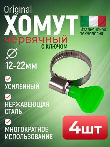 Хомут червячный (винтовой ) 12-22 мм, 4 шт с ключом Бабочка, нержавеющая сталь W2