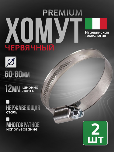 Хомут червячный Premium 60-80 мм, 2 шт нержавеющая сталь W2, ширина 12 мм