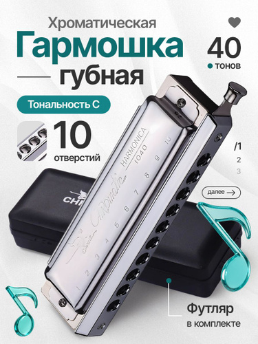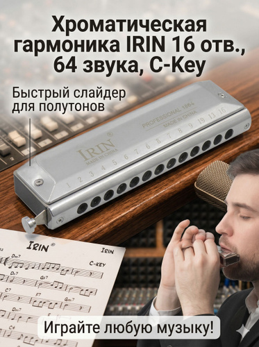Хроматическая гармоника, 16 отверстий, 64 ноты, ключ C, профессиональный уровень исполнения.
