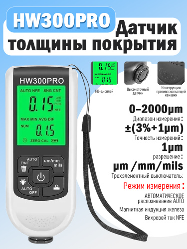 Толщиномер лакокрасочных покрытий, HW-300PRO, измерение покрытия FE/NFE, 0-2000 m