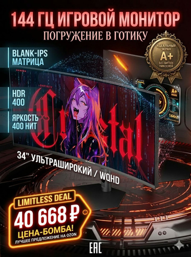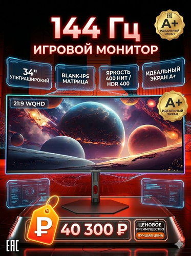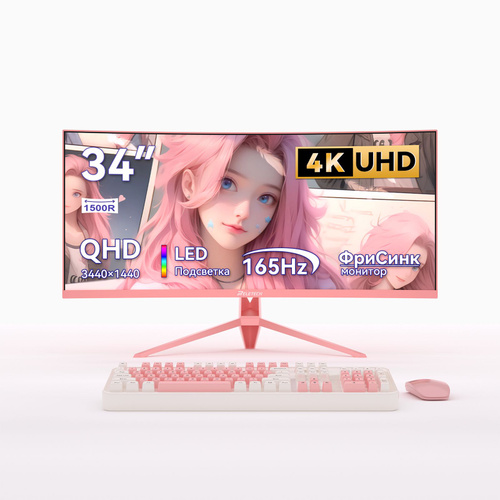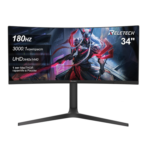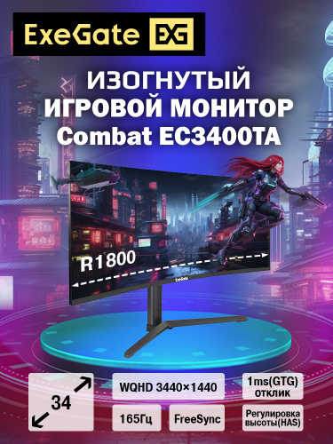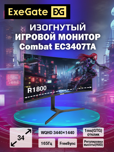 ExeGate 34" Монитор Combat EC3407TA (VA Curved R1800, UltraWide QHD 3440x1440@165Гц, 21:9, 300cd/m2, 4000:1, 178°/178°, 1ms, 2xHDMI2.0, 2xDisplayPort, audio-out, Speakers, RGB-подсветка, Flicker-free, FreeSync, Low Blue Light, кабель DP 1.5м, VESA, регулировка высоты, регулировка наклона, поворот экрана), черный