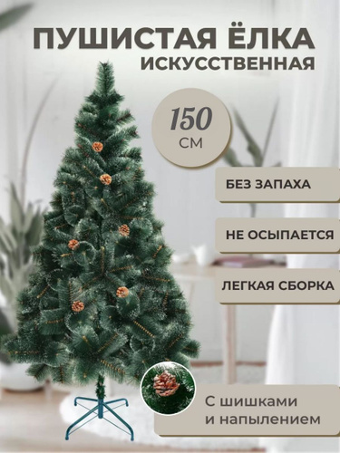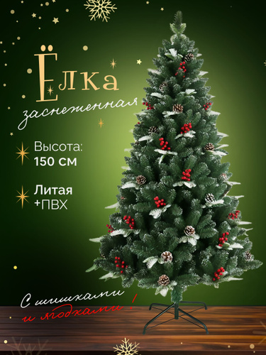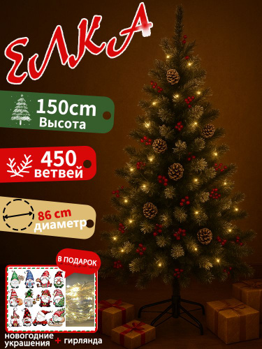 Елка искусственная новогодняя 150 см с ягодами и шишками, литая+пвх ель